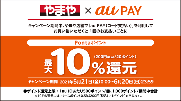 | 条件 | キャンペーン期間中にやまや店舗でau PAY(コード払い)の利用で10%還元 |