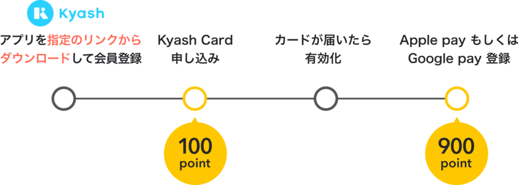 ・Kyash Card申し込み後、対象期間中にApple PayまたはGoogle Payをご登録できなかった場合には、100ポイントのプレゼントとなります。