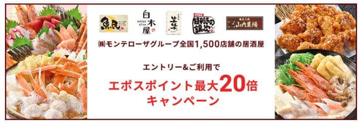 - モンテローザ対象店舗の利用でエポスポイント最大20倍=10%還元(税込200円につき20ポイント)