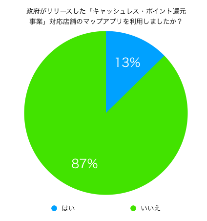 「政府がリリースしたキャッシュレス・ポイント還元事業対応店舗のマップアプリを利用しましたか?」という質問で、利用したことがあると答えた方は13%にとどまりました。9割近くの方が使ったことがありません。