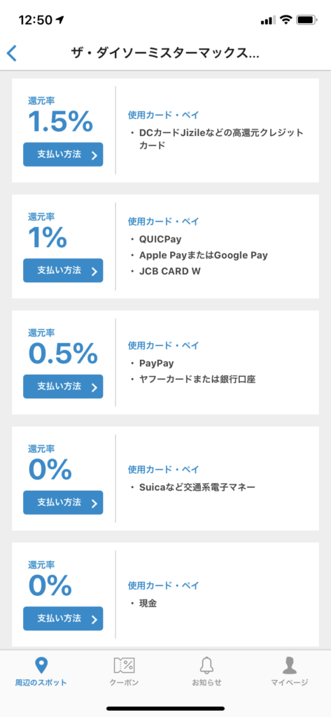 第5位は還元率0.5%の「PayPay残高払い」です。この方法はPayPayが利用可能な店舗で使用でき、PayPayポイントとして還元されます。