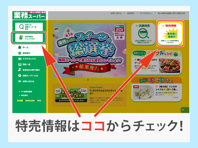 業務スーパー公式サイトには、特売チラシや月間特売情報をチェックできる専用ページがあります。