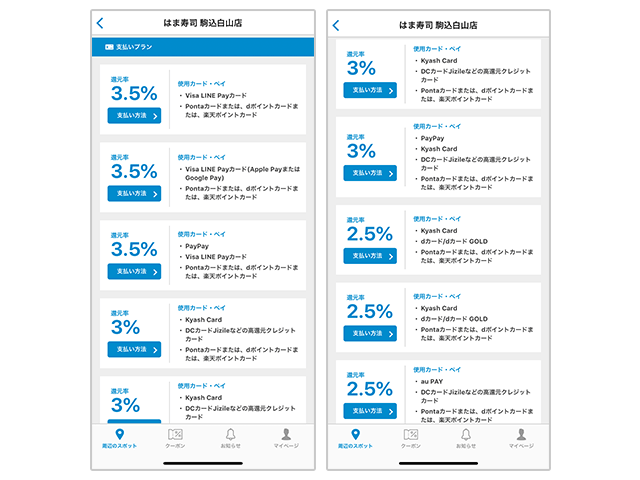 クレジットカード対応のはま寿司各店舗で利用でき、還元されるポイントは上記表の「還元方法」欄の通りです。