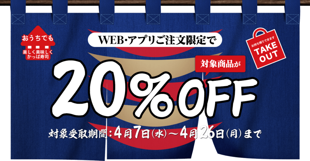 【かっぱ寿司】テイクアウト20%OFFキャンペーン 4月7日〜4月26日
