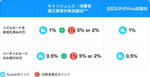 付与されるポイントは、登録したKyashのカードの種類によって異なります。還元率は以下の通りです。