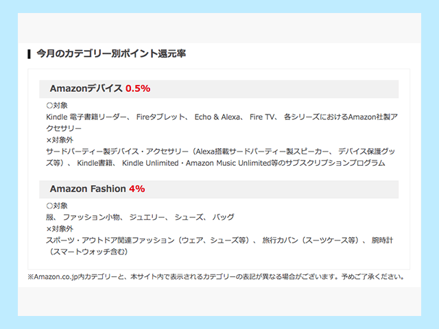 つまりオリコモール経由のAmazonショッピングは、毎月「ポイント還元される商品カテゴリ」と「還元率」が異なるということ。