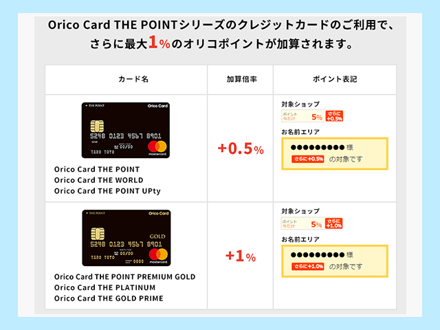 またオリコカードのなかでも「オリコカード ザ ポイント」など対象カードを持っている場合、還元率がアップ。