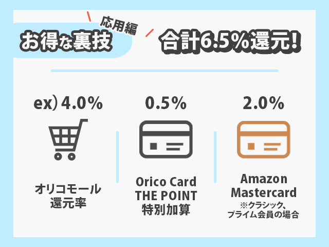 上記を応用すると、Amazonカード(Amazon Mastercard)とオリコモールを活用して、高還元なお買い物が可能になります。