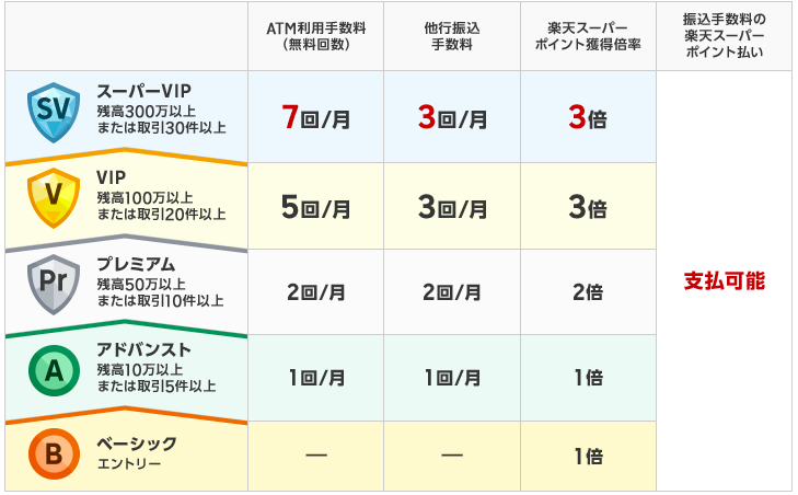 つまり、ハッピープログラムにはランクがあり、ランクを向上させるとATM利用手数料・銀行振込手数料が無料にできる回数が増えます。