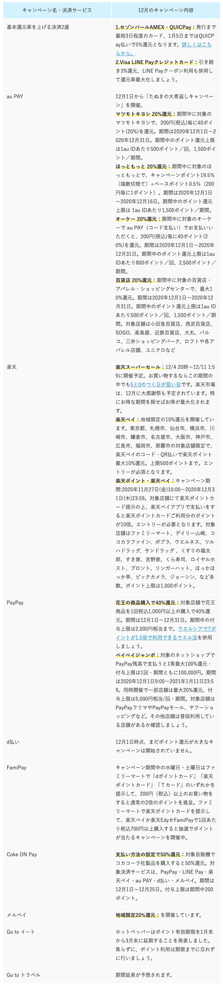 | キャンペーン名・決済サービス | 12月のキャンペーン内容 |