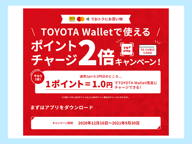 TS CUBIC CARDをひも付けた状態でWallet QRを使い、期間中にTOYOTA Walletの残高にチャージすれば1%還元(※)が可能ですよ。