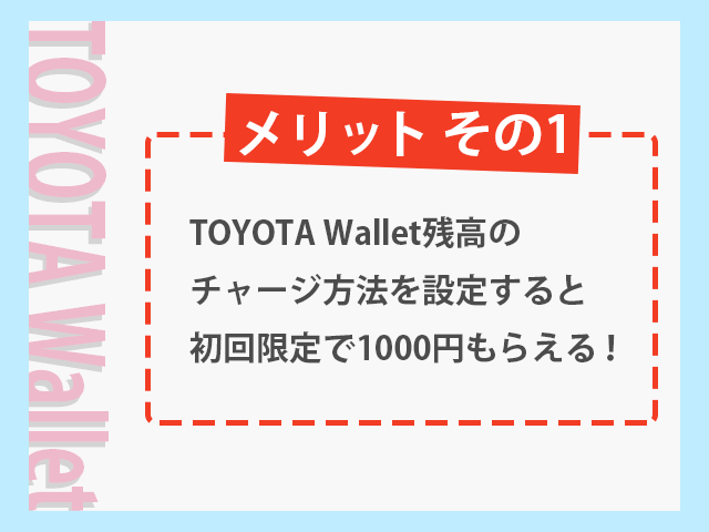 TOYOTA Walletは現在、TOYOTA Walletの残高のチャージ方法を初めて設定した方に限り、残高1000円分をプレゼントしています。