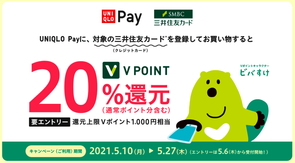 三井住友カードをUNIQLO Payに登録して利用すると20%還元のキャンペーンを開催します。