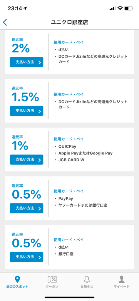 PayPay・d払いが使用できる店舗で使え、還元方法は「PayPayポイント」か「dポイント」になります。