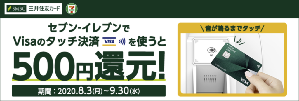 Visaタッチが使える三井住友カードは、Visaタッチをセブンイレブン利用で500円プレゼントキャンペーンを実施しています。