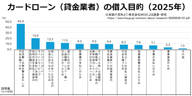この調査結果によると、カードローンは生活費目的で借入している人が多く、続いてクレジットカードやネットショッピング利用の不足を補うため、買い物や遊興費目的の順になっています。